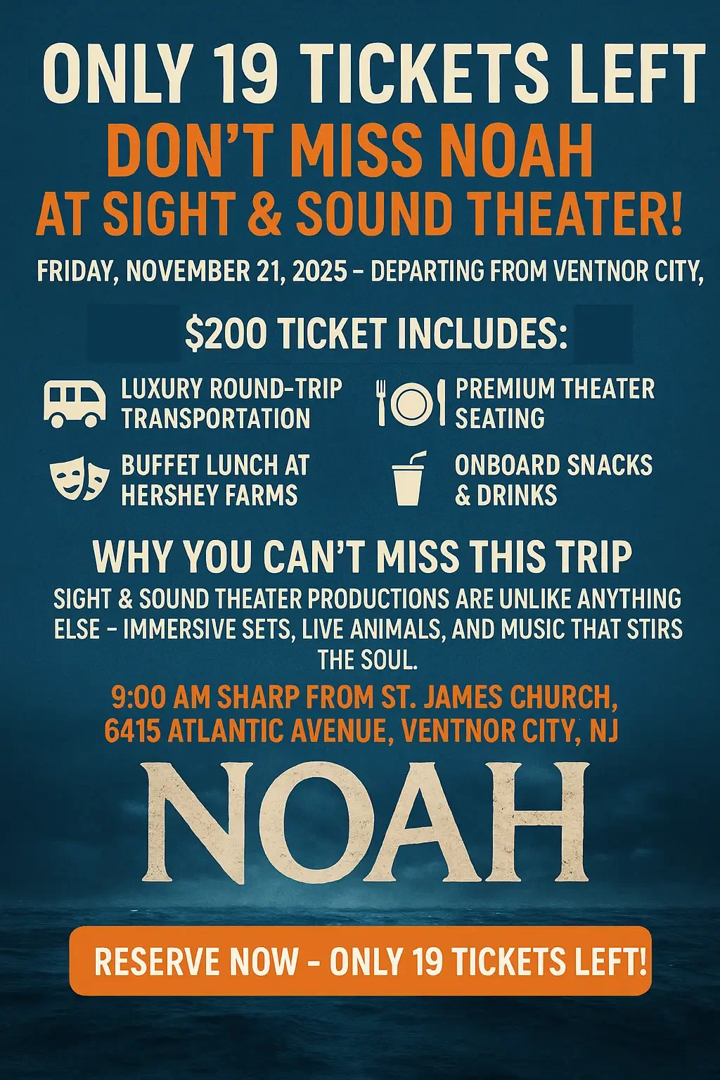 If you’ve been thinking about joining our all-inclusive day trip to Sight & Sound’s breathtaking production of NOAH — now is the time to act. We’re down to just 19 tickets remaining, and they will go quickly!